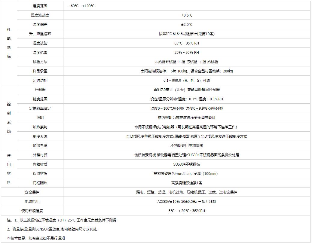 光伏湿冻试验箱适用于光伏组件(太阳能电池板)做热循环、湿冻循环、高温高湿双85试验,以确认组件能否承受高温高湿之后随之的负温度影响,以及对于温度重复变化时引起的疲劳和热失效,另外确定光伏组件曝露在高湿度下而产生的热应力及能够抵抗湿气长期渗透的能力.是光伏组件行业必不可少的测试设备。
