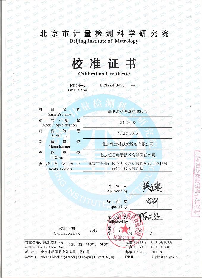 >>¸ßµÍν»±äʪÈÈÊÔÑéÏäУ׼֤Êé-±±¾©¼ÆÁ¿Ôº-³¬Ë¼µç×Ó