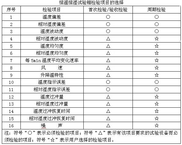 恒温恒湿试验箱首次检验/验收检验和周期检验时,若无其他规定,按下表选择检验项目。